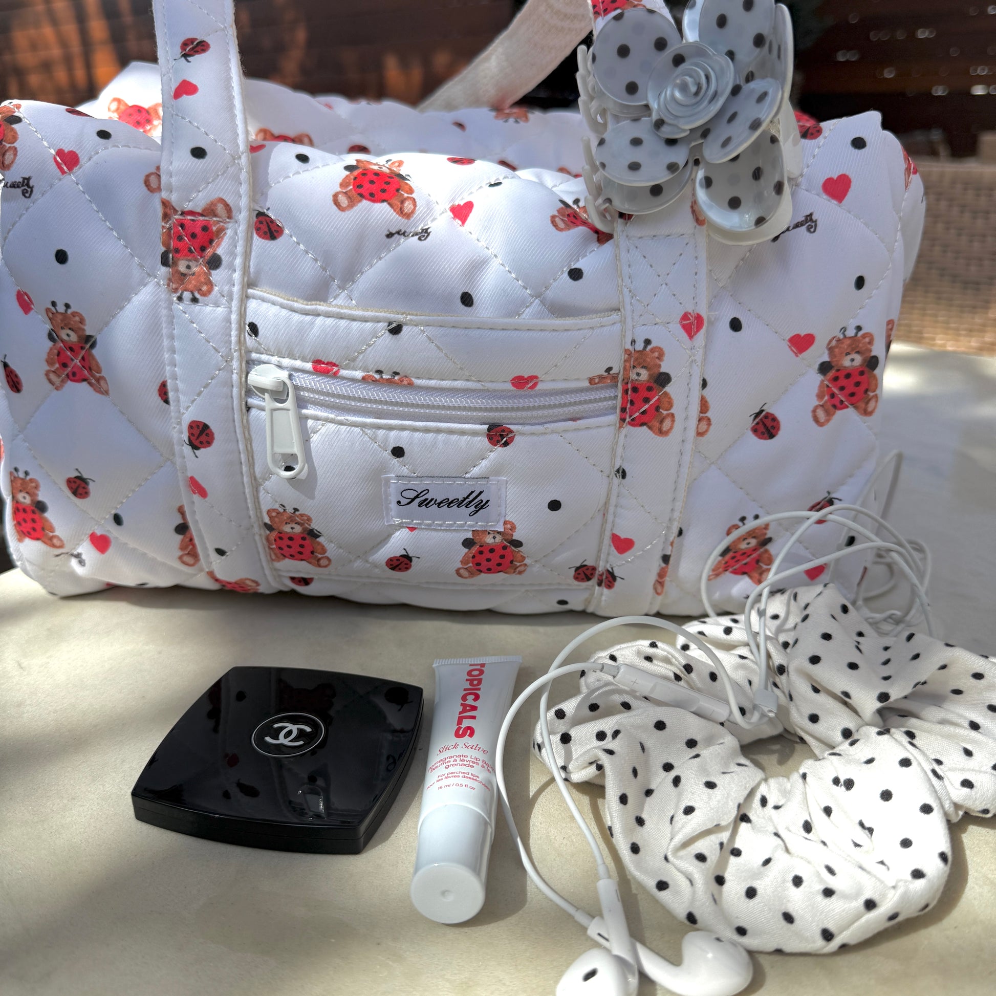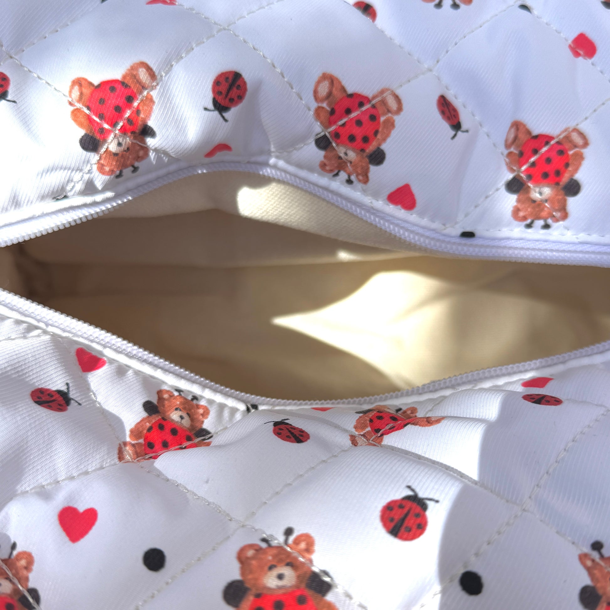 sweetly lovely ladybug quilted bag with tan cotton canvas interior and two exterior pockets